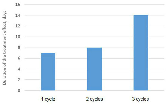 Figure 3 shows graphs of the dependence of the average content of SRB cells in three parallel experiments for several treatment cycles on time. It can be seen from the graph below that a significant decrease in the growth rate of SRB colonies is achieved already during the first and second cycles of sonoplasma treatment, and after the third treatment cycle, bacterial growth is suppressed up to 14 days. The diagram shown in Figure 4 shows the prolonged effect of suppressing the vital activity of SRB colonies during water treatment, depending on the number of treatment cycles. After one cycle of water treatment, a decrease in SRB growth is observed for about 7 days, and the duration of this effect increases with an increase in the number of cycles to 14 days after three treatment cycles.