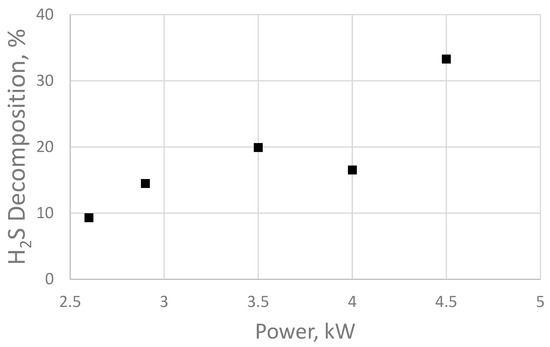 Figure 5 demonstrates that the degree of hydrogen sulfide decomposition increases linearly with increasing electrical pulse power; however, the data for 4 kW contradict the general trend. This may indicate that the 4 kW (40 kHz) operating mode is the least energy-efficient from the point of view of the generator electrical circuit. The obtained data correspond to the results of the work in [37], which studied the decomposition of hydrogen sulfide under the influence of dielectric barrier discharge plasma. However, E. Linga Reddy and his research group used a laboratory setup based on the formation of a plasma discharge in gas to obtain these results. Such a system cannot be used for water treatment.