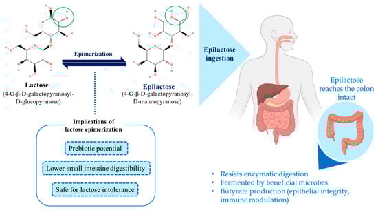 Given its bifidogenic and butyrogenic properties, high tolerability, and additional metabolic effects, epilactose emerges as a promising functional ingredient for applications in dairy products, nutritional supplements, and specialized formulations targeting infant nutrition, osteoporosis prevention, and metabolic disorders. Potential synergies may be achieved when combined with other prebiotics such as galacto-oligosaccharides (GOS) to broaden microbial stimulation [4].