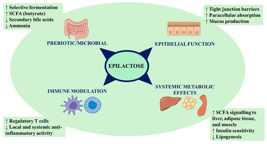 Therefore, the mechanisms of epilactose include: (1) modulation of the microbiota with increased beneficial SCFA and reduced toxic metabolites; (2) strengthening of the epithelial barrier and increased mineral absorption; (3) local and systemic anti-inflammatory effects mediated by SCFA; (4) metabolic regulation through intestinal-peripheral tissue signaling (Figure 2).