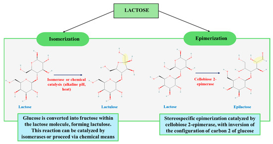 Comparative pathways of lactulose and epilactose synthesis from lactose by isomerization and epimerization.