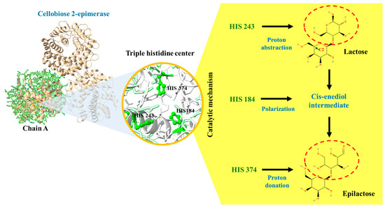 The active site of C2E from Ruminococcus albus contains highly conserved residues that play central roles in the catalysis of epimerization. Among them, His184, His243, and His374 form a triple histidine center responsible for proton transfer during the reaction. Initially, His243 acts as a base, abstracting the axial proton of the hydroxyl group attached to the C-2 carbon of the glucose unit of lactose, leading to the formation of a cis-enediol intermediate. This intermediate is stabilized by interactions with His184, while reprotonation on the opposite face is promoted by His374, resulting in stereochemical inversion at C-2 and formation of epilactose. The residue Glu187 also contributes to the polarization of the hydroxyl group, facilitating proton abstraction. This mechanism occurs without breaking the glycosidic bond and gives the enzyme high selectivity in the stereoselective conversion of disaccharides such as lactose, cellobiose and maltose into their respective epimers: epilactose, epicellobiose and epimaltose [50,51,52].