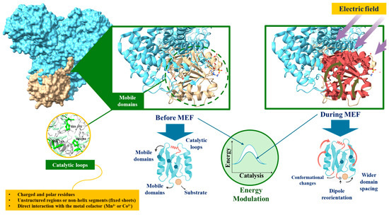 The application of electric fields to modulate enzyme activity has been studied as a functional strategy to alter the catalytic performance of enzymes without relying on chemical or genetic modifications. Among the available methods, MEFs stand out for their physical, non-invasive, reversible properties and versatility, allowing the modulation of enzyme activity without modifying the primary structure of the protein or resorting to genetic engineering or covalent immobilization, procedures that generally involve greater technical complexity and operational costs [15]. This approach has advantages in contexts that demand high reproducibility and precise control of enzyme kinetics [15,59].