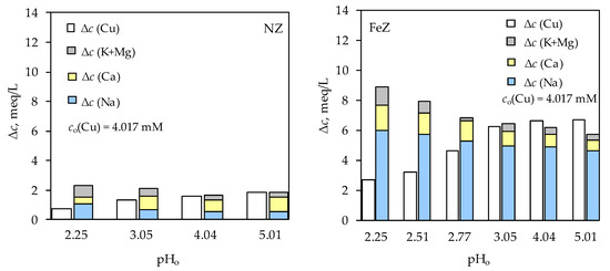 Interrelationship between in-going Cu(II) ions and out-going exchangeable cations for both initial concentrations and both samples is mostly non-stoichiometric. At extremely acidic pH, where the lowest removal efficiency was recorded, the highest non-stoichiometry is observed for both samples, which is a consequence of the competition between Cu2+ and H+ ions. Non-stoichiometry is more pronounced for FeZ, which is a result of a more pronounced negative charge of the FeZ surface, and thus the more significant influence of the competitive effect. Already at pHo ≥ 3.05 for NZ and at pHo = 3.05 for FeZ, the competitive effect is almost negligible since the non-stoichiometric interrelationship is the least pronounced. Furthermore, for FeZ at pH ≥ 4.04, a non-stoichiometric relationship is again observed, but of a reverse character. The non-stoichiometry is reflected in a higher amount of sorbed Cu(II) ions compared to the released exchangeable cations. This is a consequence of Cu(II) precipitation, which additionally contributes to the increase in removal efficiency, which is in accordance with the results shown in Figure 2. These findings suggest and reaffirms that the optimum pH for NZ is in the range of pHo = 3–5, and for FeZ, it is pHo = 3.