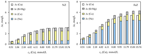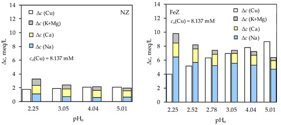 Furthermore, for both samples, NZ and FeZ, the removal efficiency increases with increasing pHo value. Comparing the Cu(II) removal efficiency values for both samples and for both initial concentrations, significantly higher removal efficiency was achieved for FeZ compared to NZ. This indicates that the zeolite modification significantly contributed to the reduction in Cu(II) concentration. Namely, the zeta potential of both samples has negative values in the pH range 2–12, while FeZ having a more pronounced negative charge. This evidence argues that the electrostatic attraction between the positive Cu2+ species and the negatively charged surface of NZ and FeZ will be favorable in the acidic pH range where Cu(II) precipitation does not occur. In order to obtain a more complete insight into the effect of pHo on the sorption of Cu(II) on NZ and FeZ, the interrelationship between in-going Cu(II) ions and out-going exchangeable ions (Na, K, Ca, and Mg) from the zeolite structure was analyzed and shown in Figure 3 and Figure 4 for two initial Cu(II) concentrations.