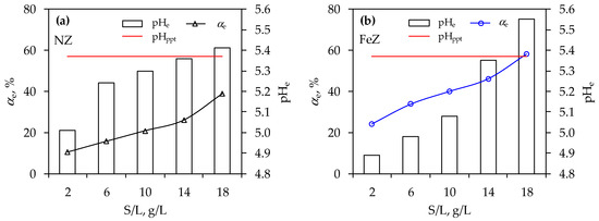 Comparison of pHe with pHppt and removal efficiency, αe at different solid/liquid ratios for (a) NZ and (b) FeZ.