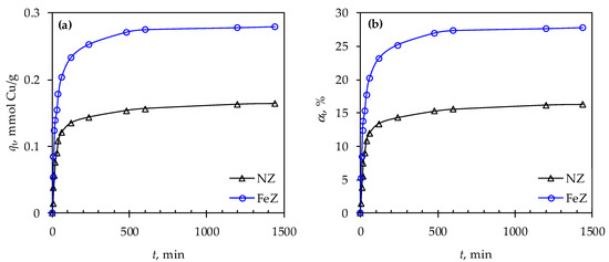 Determining the impact of contact time is important for balancing the desired efficiency and process cost-effectiveness. Figure 6 depicts time-dependent changes in the amount of Cu(II) sorbed on NZ and FeZ as well as the removal efficiency.