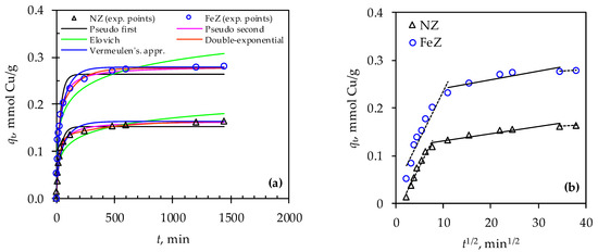 Comparison of experimental data with (a) kinetic model curves (pseudo-first-order, pseudo-second-order, Elovich, Vermeulen’s approximation and double-exponential model), and (b) the Weber–Morris model.