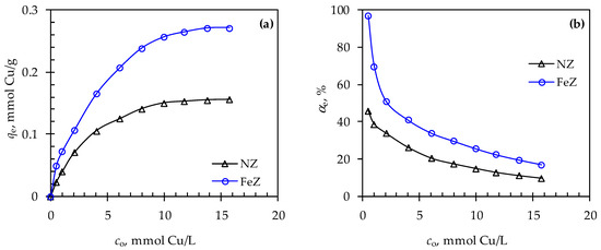 The effect of the initial Cu(II) concentration is manifested by a gradual increase in the amount of Cu(II) sorbed on NZ up to co = 10 mmol Cu/L and up to co = 12 mmol Cu/L for FeZ. Above the specified concentrations, maximum saturation of zeolite active sites is achieved. The maximum amount of sorbed Cu(II) on FeZ compared to NZ (0.271 mmol/g vs. 0.156 mmol Cu/g) is almost twice as high under optimal Cu(II) sorption conditions. Furthermore, from the aspect of Cu(II) removal efficiency, the highest removal efficiency is achieved at the lowest initial concentration, while an increase in the initial concentration decreases the removal efficiency. This indicates the need to optimize the two mentioned parameters, i.e., maximizing both sorption capacity and removal efficiency.
