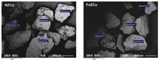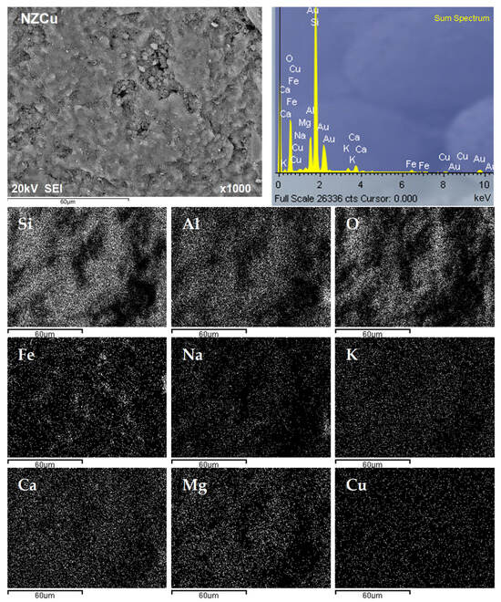 Scanning electron microscopy (SEM) combined with energy-dispersive X-ray analysis (EDS) of copper-saturated samples, NZCu and FeZCu, was performed on a JEOL JSM-6610 microscope (JEOL Ltd., Akishima, Tokyo, Japan). On selected surfaces of the analyzed samples, the semi-quantitative chemical composition was determined, and the distribution of elements on the surface was determined by mapping analysis.