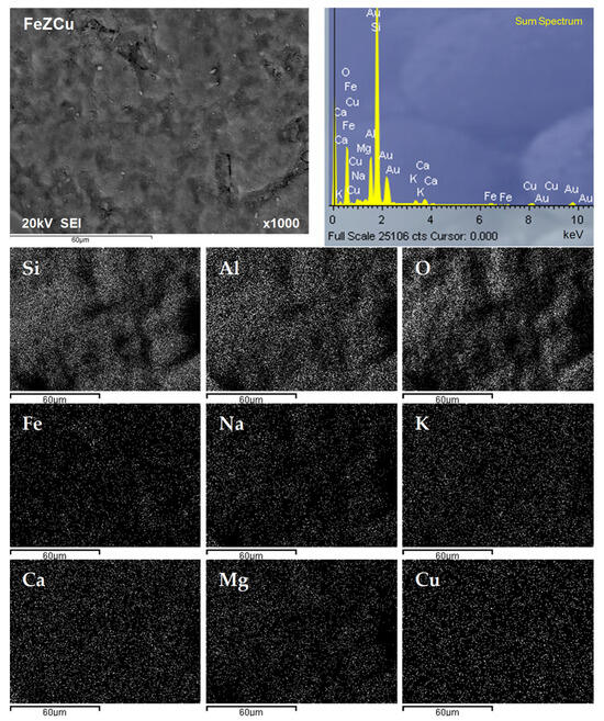 The results of the mapping analysis confirmed the uniform distribution of the detected elements on the surface of both samples (Figure 11 and Figure 12). This indicates that the exchangeable cations, and thus the active sites, are uniformly distributed on the surface of both samples. In addition, a uniform distribution of copper is observed on both zeolites, with the density of observed dots corresponding to Cu(II) being higher for FeZ compared to NZ. Ultimately, based on the results of monitoring the amount of released exchangeable cations and sorbed Cu2+ ions as well as the results of chemical composition and EDS, it can be concluded that the dominant mechanism is ion exchange initiated by electrostatic attraction between the negatively charged zeolite surface and positive Cu2+ ions.