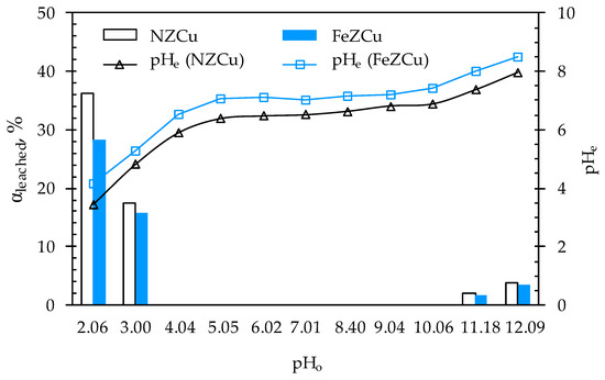 Percentage of leached copper from NZCu and FeZCu, and changes in pHe as a function of pHo.
