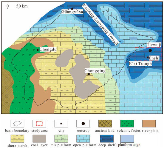 The western Hubei region is located on the Middle Yangtze Plate during the Permian, where there was passive continental margin (Figure 1). During the deposited stage of Permian shale, the sea level fluctuated with multiple volcanic events influenced by the tectonic activities of the Paleo-Tethian Ocean [24,25,26]. During the Middle Permian—Early Triassic—the E’Xi Trough developed as a rift basin in the middle of the northern margin of the South China Plate, controlled by the Jianshi–Enshi fault system. The northern part of the trough was connected to the open sea, while the other three sides were surrounded by carbonate platforms (Figure 1). The development range of the Permian shale was controlled by the E’Xi Trough, and the sedimentary sequence was mainly carbonaceous shale and siliceous shale, interbedded with multiple layers of bentonite [27].