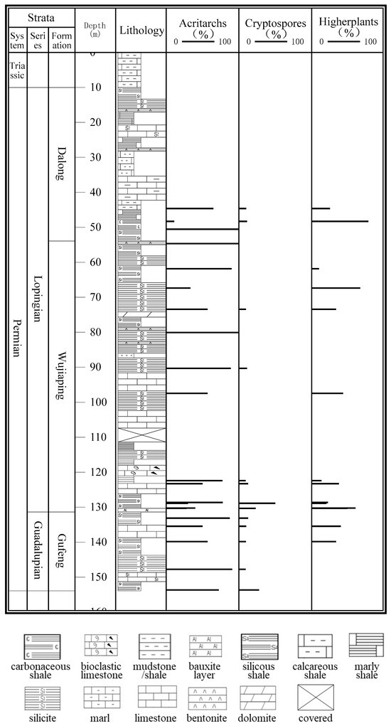 At the bottom of the Wujiaping Formation, acritarch abundance decreases significantly (average: 46%), while higher plant fragments show a marked increase (average: 35%), accompanied by a slight rise in green algae content (average: 19%). This assemblage suggests a lower sea level during the beginning of the Wujiaping Formation, leading to enhanced terrigenous input. In contrast, the middle-upper member of the formation exhibits a distinct shift in microfossil composition: acritarch abundance rebounds to 72.6% on average, while higher plant fragments decrease to 22.4%. Green algae occur only sporadically (average: 5%) (Figure 6 and Figure 7). These changes indicate renewed sea level transgression during deposition of the middle-upper Wujiaping Formation, resulting in reduced terrestrial influence. The hydrocarbon-forming microfossil assemblage in the bottom of the Dalong Formation is dominated by acritarchs (mean abundance: 59%) and higher plant debris (34%), while green algae occur in minor proportions (7%). This distinct biotic composition records a pronounced sea level fall following the deposition of the underlying Wujiaping Formation. The middle to upper Dalong Formation consists predominantly of limestone units exhibiting low total organic content. Within these carbonate-dominated intervals, the relative abundance of higher plant fragments displays a progressive upward decrease. These stratigraphic patterns suggest gradual marine transgression during Dalong Formation deposition, accompanied by a systematic reduction in terrestrial organic input (Figure 6 and Figure 7).
