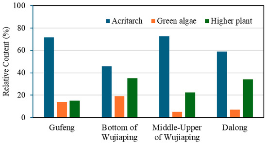 The hydrocarbon-forming microorganisms in the Permian shale of the study area primarily comprise three groups: acritarchs, green algae, and higher plant fragments. Notably, their relative abundances display marked stratigraphic variations across distinct Permian shale formations (Figure 6 and Figure 7).