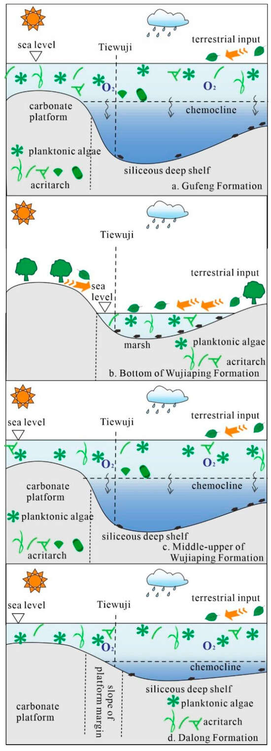 Previous studies have suggested that some acritarchs, e.g., Proterocladus, Veryhachium, Siphonophycus, and Dictyotidium, mainly lived in shallow marine environments [41,42]. These types of acritarchs were found easily in all layers of the Tiewuji outcrop. Therefore, it can be inferred that the sedimentary period of Permian shale in the study area was generally in a shelf environment. Integrated analysis of outcrop lithology and published geochemical data indicates that the Permian marine shales in western Hubei were predominantly deposited in a deep shelf environment, with depositional patterns strongly controlled by the tectonic evolution and spatial configuration of the E’xi Trough. It was characterized by stable anoxic-reducing conditions, which favored organic matter enrichment. The shale in this region mainly consists of siliceous shales and silicite with high TOC. In the study area, the Gufeng Formation and Wujiaping Formation shales are the most favorable, having formed in a high paleoproductive environment influenced by distal volcanic activity. The volcanic tuff layers correspond to periods of biological prosperity, further enhancing organic matter preservation. In summary, the depositional environment of these shales was characterized by (1) persistent deep-water conditions, (2) minimal terrigenous influence, (3) high primary productivity, and (4) anoxic to sulfidic water column conditions—all critical factors contributing to their exceptional shale gas potential. This study systematically reconstructs the organic matter sources and their evolutionary pathways in western Hubei’s Permian shales, providing fundamental insights for hydrocarbon exploration. The hydrocarbon-forming organisms in the study area’s Permian shale primarily consist of acritarchs (sourced from planktonic algae), with subordinate contributions from higher plants and green algae. During the deposition of the Gufeng Formation, elevated sea levels prevailed. The E’xi Trough was characterized by a siliceous deep shelf environment, where black siliceous shale and silicite deposits accumulated. Organic matter in these sediments was predominantly derived from planktonic algae, with minor terrigenous input (Figure 8a). The sea level at the bottom of the Wujiaping Formation is relatively low, with the lithofacies turning into a gray bauxite layer and mudstone. The overall environment of the E’xi Trough was coastal marsh, with mixed sources of organic matter, mainly including aquatic plankton, and an increase in the content of green algae and terrigenous organic matter (Figure 8b). The deposited stage of upper-middle members of the Wujiaping Formation turned into a siliceous deep shelf environment once again in the E’xi Trough, in which the strata consisted of black silicite and siliceous shale. The organic matter was predominantly derived from planktonic algal sources, with minor terrigenous contributions (Figure 8c). Subsequently, the sea level of the E’xi Trough in the Dalong Formation decreased, with a slope at the front edge of the platform and a siliceous deep shelf with dark gray siliceous shale and calcareous shale. The organic matter was predominantly derived from planktonic algal sources (Figure 8d).