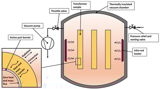 In this study, a simplified yet sufficiently sophisticated drying system is considered, which is designed to enable control of the two primary process variables: drying temperature and pressure. As illustrated in Figure 1, the system consists of a thermally insulated vacuum chamber with two ports. The first port is connected to a vacuum pump through the suction line, with a throttle valve installed to reduce or completely shut off the pumping speed when necessary. Additionally, to ensure that no significant over-pressure occurs and to enable the venting process at the end of each vacuum phase, a vacuum chamber is equipped with a valve with both breathing and venting functions. Lastly, the heating of the cellulose insulation is achieved with infrared (IR) heaters mounted on the inner walls of the vacuum chamber shell. In addition to radiation, the heat is also being transferred by natural convection since no fan or forced air circulation is employed.