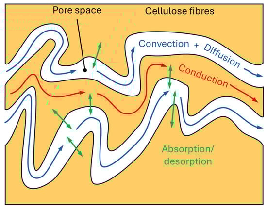 Heat and mass transport mechanisms through cellulose insulation.