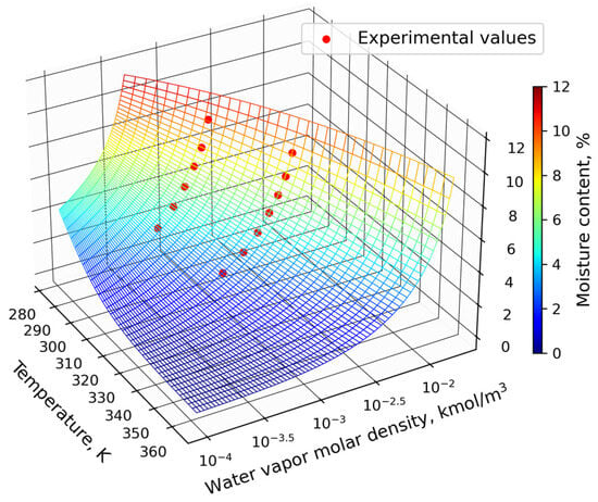 where [1/s] is an internal overall mass transfer coefficient whose value depends on the resistance of the moisture transport from the inner parts of the cellulose fibres to the pore–fibre interface. It also strongly depends on the total pore–fibre interface surface area per unit of volume of the insulation. Accurately calculating is not an easy task, so a simplified approach is undertaken in this work, assuming a constant value that should be empirically determined.
