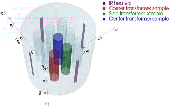 In addition to specifying parameter values and their interrelations, solving the governing equations requires prior computation of the view factors. This was carried out firstly by generating a rudimentary geometry of the surfaces that exchange heat by radiation, namely, the IR heaters, transformer samples, and vacuum chamber walls, as shown in Figure 4. The generated mesh is a prerequisite for the computation of view factors; however, it is not necessary to calculate them for all cells since reciprocity and summation rules can be applied [34].
