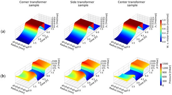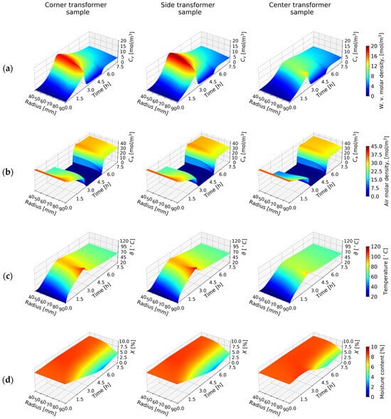 It is assumed that the partial pressures of water vapor and dry air at the interface are equal to those in the vacuum chamber atmosphere. Therefore, for all transformer samples, the following equations hold: