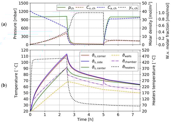 The governing equations at the scale of the vacuum chamber are derived under the assumption that temperature, pressure, and molar densities of water vapor and dry air are uniformly distributed fields within the available volume (m3) inside the vacuum chamber. Moreover, the temperature fields of the chamber walls and IR heaters are also considered uniform and dependent only on the time variable.