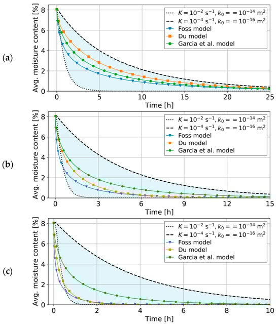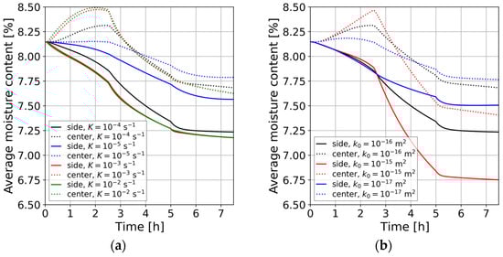 Numerical simulations for all studied cases, including the test case, drying case, and comparative scenarios, were carried out using the physical properties for non-impregnated Kraft paper, reflecting its role as a standard transformer cellulose-based insulation material. All parameter values and functional relations are listed in Table A1, Table A2, Table A3 and Table A4 given in Appendix A. The exceptions are two parameters: the absolute permeability , and the internal overall mass transfer coefficient , for which a series of values were used to study their influence on moisture dynamics. Additionally, for the purpose of comparison with Fickian diffusion models, certain parameters were adjusted to ensure a meaningful evaluation.