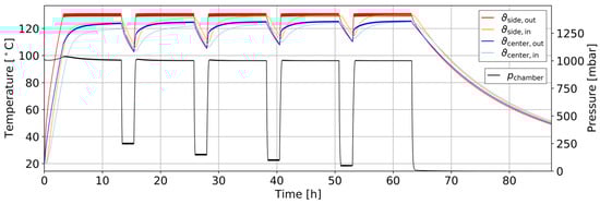Initially, all components of the vacuum drying system as well as the cellulose insulation are assumed to be at ambient temperature. The gaseous phase inside the pores of the cellulose insulation and the atmosphere of the vacuum chamber are under ambient pressure and ambient relative humidity. In that case, the initial moisture content of the cellulose insulation corresponds to the equilibrium moisture content for a given state of ambient air. The initial conditions are as follows: