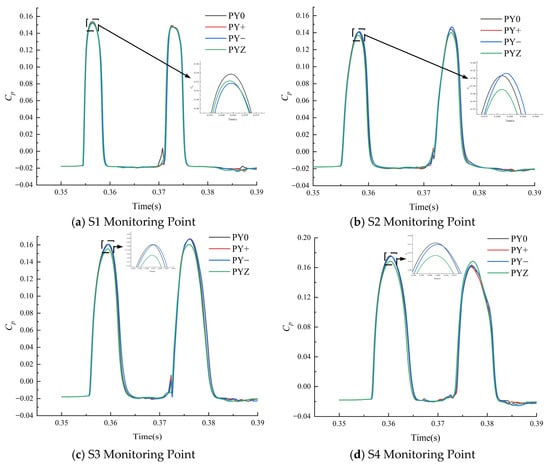 Figure 9 presents the relative amplitude of pressure pulsation at the bucket monitoring points, with the corresponding pressure pulsation coefficients illustrated in Figure 10. Along the division blade, as the position moves from the tip toward the bucket root, the influence of radial offset on pressure pulsation progressively intensifies. The closer the location is to the root, the greater the observed pressure fluctuation. The amplitude initially increases and then decreases, reaching a maximum of 20% at point S5, indicating that regions near the root are more vulnerable to damage under radial offset conditions. On the bucket working face, the effect of radial offset on pressure pulsation similarly escalates from the division blade tip toward the root. The pressure pulsation amplitude under radial offset conditions surpasses that observed under the no-offset condition. Notably, the amplitude is higher under the PY+ condition compared to the PY− condition, highlighting a more pronounced effect when the jet is radially offset in the positive direction. Additionally, the axial offset (PYZ) has a more significant effect on pressure pulsation than the radial offset does, with its amplitude surpassing that of the radial offset conditions.