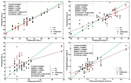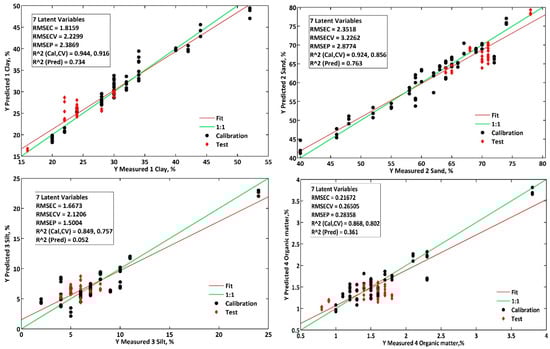 PLS calibration models were developed by SOLO + MIA software version 8.7.1 (Eigenvector Research, Inc., Manson, WA, USA) using two versions of the SIMPLS algorithm: PLS1 and PLS2. PLS1 was applied for the individual determination of clay, sand, silt, and organic matter, corresponding to the case where there is only one dependent variable at a time. PLS2 allows for the simultaneous quantification of the dependent variables.