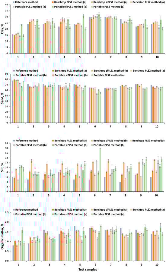 Nevertheless, when examining the performance of the PLS2 models developed for the four analytes investigated, no significant differences (p > 0.05) were observed in the clay, sand, silt, and organic matter results. The PLS2 models showed higher RPD values for sand quantification than the PLS1 and siPLS1 models.