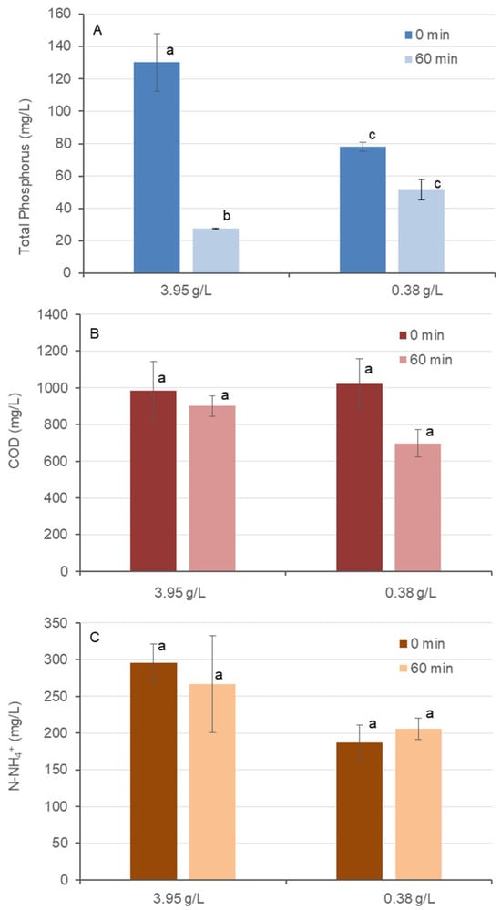 P (A), N-NH4+ (B) and COD (C) concentrations in the piggery wastewater before and after adsorption with biosorbent dosages of 3.95 g/L and 0.38 g/L of biosorbent. Identical letters above the treatments in the graph indicate no statistically significant difference between the compared groups.