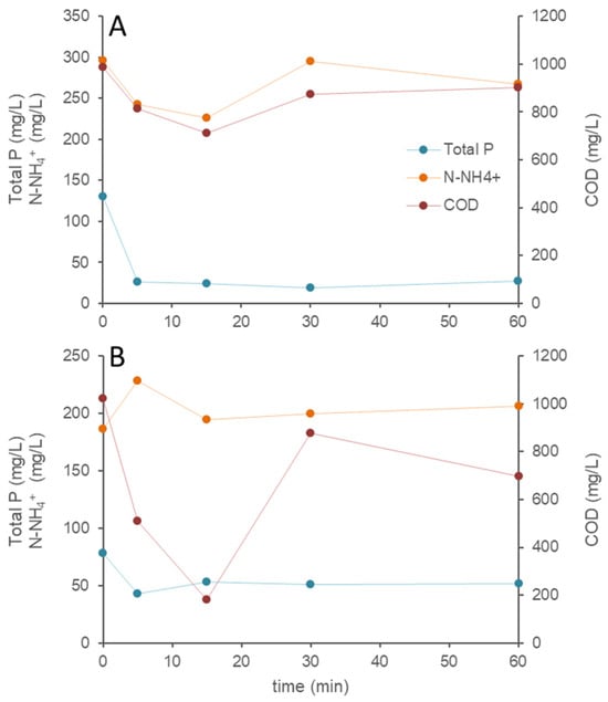 Adsorption experiments were performed in a thermostatically controlled stirred bath (MARQ LABOR, Brazil) under continuous agitation at 100 rpm and a constant temperature of 25 °C. Samples were collected (0, 5, 15, 30, and 60 min), centrifuged (2150× g for 2 min), and used for phosphorus, nitrogen, and chemical oxygen demand (COD) concentration analysis. The removal efficiency (RE) was calculated according to Equation (1) [5].