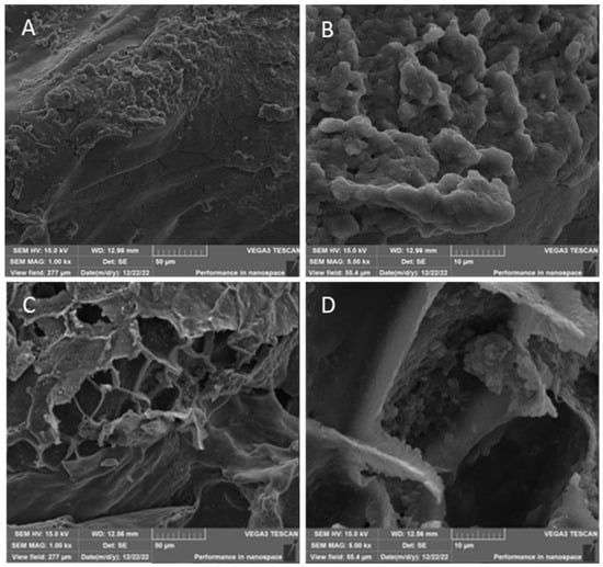 SEM images of the hydrogel-based adsorbent before—(A) 1000× and (B) 5000×—and after—(C) 1000× and (D) 5000×—piggery wastewater adsorption.