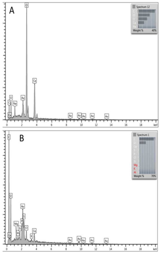 EDS before (A) and after (B) the piggery wastewater adsorption.