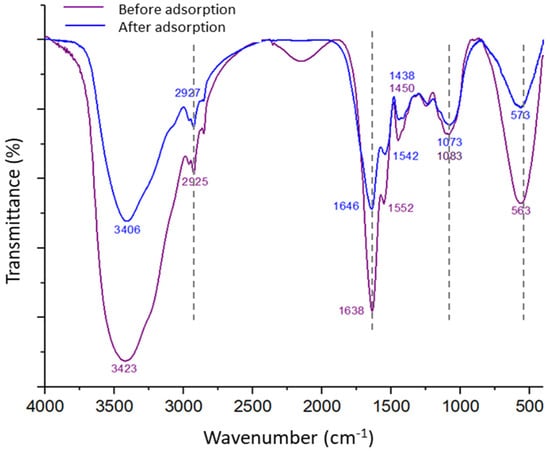 FTIR of the ALE beads before and after the piggery wastewater adsorption.