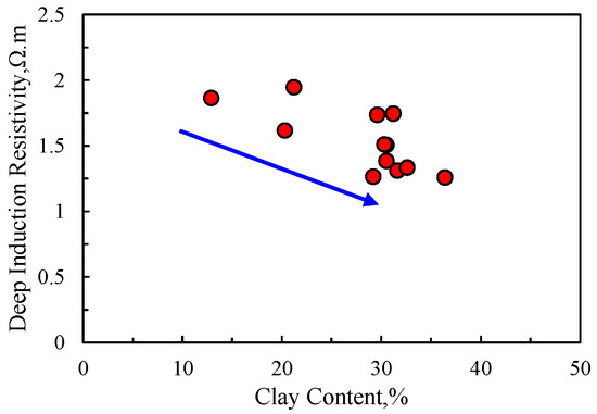 The measured results of X-ray diffraction experiments in the laboratory clearly illustrated that our target formation features a high clay content and its lithology is dominated by clay and argillaceous siltstone, while core samples recovered from conventional reservoirs exhibited lower clay contents (Table 1). Generally, a high clay content always increases Swi, thus decreasing the resistivity [24]. Figure 1 clearly indicates that the deep induction resistivity (Rt) was inversely related to clay content. The other factor, the low pyrite content (with an average value of 0.77%), was too low to reduce resistivity. From Table 1 and Figure 1, we can conclude that a high clay content decreases the resistivity in gas-bearing reservoirs.