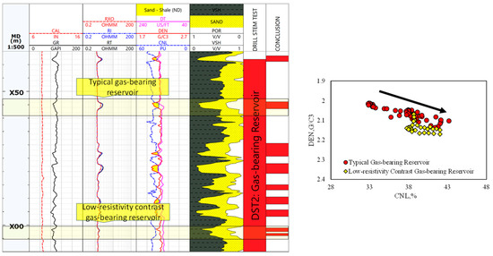 Comparison of log responses of typical and low-resistivity contrast gas-bearing reservoirs in a well with DST data.
