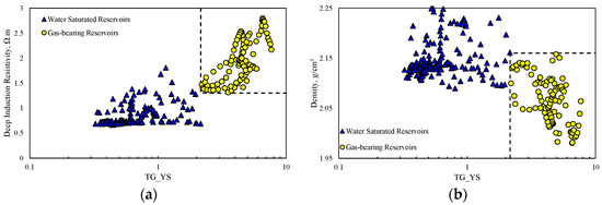 During drilling, when encountering a gas-bearing formation, the gas within the pore space might infiltrate into the drilling fluid due to rock fragmentation and seepage. Consequently, gas-logging data can be used to directly identify hydrocarbon-bearing formations. Meanwhile, resistivity is crucial in identifying pore fluids. In this study, we combined the peak-to-base ratio of total gas (TG_YS) with conventional logging data and significantly enhanced the accuracy of pore fluid identification. Figure 11a,b shows the cross-plots of deep induction resistivity and density versus TG_YS. These two cross-plots effectively differentiated gas-bearing formations from water-saturated intervals.