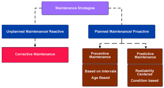 The significance of maintenance has increased throughout the years with extensive mechanization and automation. Maintenance now plays a crucial role in the industrial sector, and its expenses account for a substantial portion of the manufacturing costs of an enterprise [1]. Existing literature broadly outlines three primary maintenance methods; namely, Corrective Maintenance (CM), Preventive Maintenance (PM), and PdM methods [2]. CM is the simplest and consists of fixing the equipment only after failure. While simple, CM often results in expensive production interruptions and unscheduled component replacements. PM involves scheduling regular maintenance tasks for specified equipment to reduce the probability of failures. Maintenance is performed while the machine remains operational to prevent unforeseen malfunctions and the resultant downtime and expenses [3,4]. While PM may decrease repair expenses and unanticipated downtime, it leads to superfluous maintenance. The assessment of when equipment will wear out relies on an assumed failure rate rather than empirical data regarding the state of the particular equipment. This frequently leads to expensive and entirely superfluous maintenance activities, resulting in increased planned downtime and necessitating complex inventory management [5]. Figure 1 illustrates the hierarchy of maintenance strategies.