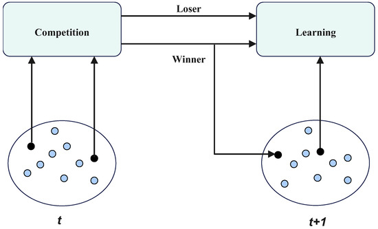 The integration of CSO into PLSCO transforms the algorithm’s exploitation phase by addressing the inherent limitations of PLO. CSO introduces a structured, adaptive approach to local refinement, ensuring that high-quality solutions are continuously improved as shown in Figure 3. This is achieved by continuously refining the best solutions and exploring regions of possible solutions with worst-performing particles. This refinement complements the global exploration capabilities introduced by SSA, creating a dynamic balance between exploration and exploitation. The CSO improves upon the PLO algorithm by introducing a competitive mechanism. The population of search agents (set to an even number) is randomly divided into pairs. In each pair, one agent is designated as the winner and the other as the loser, based on their fitness values. Winners are directly carried over to the next generation without modification, while losers update their velocity and position by learning from the winners. This approach ensures that agents are updated in each iteration, preserving the optimization process of PLO while enhancing performance. The velocity and position of a loser in the -th pair at iteration are updated using Equations (22) and (23) [41].