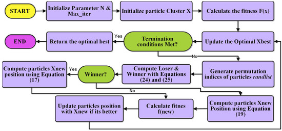 is the position of the winner in the -th dimension. represent the position and velocity of the loser in the -th dimension, respectively. denotes the average position of the entire population in the -th dimension. , and are random stochastic vectors in , influencing the learning behavior; is a predefined parameter regulating the influence on velocity. For winner and loser selection, a random permutation of the population indices, denoted as , is created as the randomized pairing of agents. For each iteration of the pairing process, k represents the loop index that determines the pairs of agents being compared. represent the first agent in the pair , and is a second agent in the pair . The winner and loser are determined using Equations (24) and (25) [42].