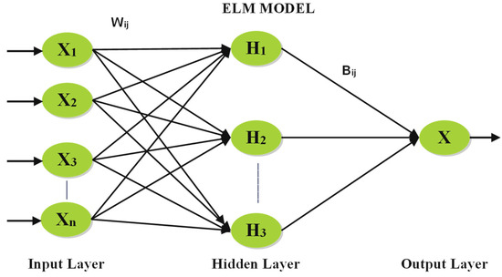 The ELM addresses the limitations of traditional feedforward neural networks, extensive parameter tuning, and excessive time by introducing a single hidden layer architecture with gradient-free learning. ELM is widely applied due to its rapid learning capability and ability to model both linear and nonlinear systems [43]. For pairs of observations , where is the input and is the target, ELM randomly initializes the input weights and hidden biases . The output weights are then computed using a direct matrix solution. The output of the ELM is expressed in Equation (26).