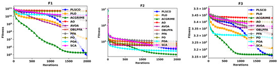 In the experiments conducted using the CEC2015 test functions, two key metrics were evaluated: the Average (AVG) and Standard Deviation (STD) of results, as presented in Table 3. The unimodal functions selected for this study were specifically used to assess the exploitation capabilities of the algorithms. The results indicate that for the test function F1, the proposed PLSCO achieved the lowest mean value, outperforming all compared algorithms. However, for F2, ACGRIME demonstrated superior performance, while algorithms such as AO, PO, POA, and SCA exhibited subpar performance in these functions. For the multimodal functions (F3–F5), PLSCO consistently outperformed other algorithms in terms of average values, highlighting its superior accuracy in addressing multimodal optimization problems. An exception is observed in F5, where PLSCO achieved results similar to POA, which remained the most accurate optimizer among the comparisons. In the hybrid function tests (F6–F8), PLSCO exhibited varying performance. While it was less accurate than ACGRIME for F6, it achieved better mean values and greater stability, as reflected in lower standard deviations for F7 and F8. These results underscore the improved capability of PLSCO to handle hybrid problems with diverse characteristics effectively. The improvement of ACGRIME in F2 and F6 is attributed to ACGRIME’s enhanced optimization ability in specific unimodal landscapes and hybrid functions with narrow optima, where its adaptive chaotic perturbations provide improved precision. Also, according to the no free lunch theorem, no single algorithm can be efficient for all optimization problems [54]. For composite functions (F9–F15), PLSCO demonstrated outstanding performance, particularly in F11, F13, F14, and F15, achieving solutions closest to the global optimum compared to other algorithms. These results validate the algorithm’s robust ability to optimize complex, high-dimensional problems with composite structures.