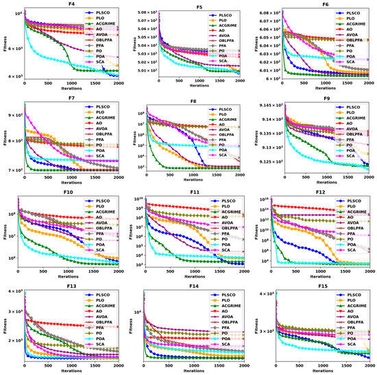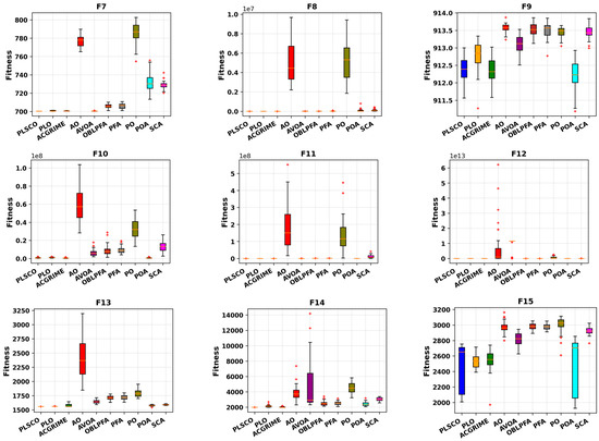 In this section, the performance of the proposed optimization algorithm is evaluated and compared against existing and improved algorithms prior to its application to the predictive maintenance problem. The evaluation is conducted using two established benchmark function suites: CEC2015 and CEC2020. The experimentation and analyses employ the CEC2015 test suite to assess the algorithm’s capabilities. This suite comprises single-modal functions (F1–F2), multimodal functions (F3–F5), hybrid functions (F6–F8), and composite functions (F9–F15) [44]. Similarly, the CEC2020 test suite includes F16 (single modal functions), F17–F19 (basic multimodal functions), F20–F22 (hybrid functions), and F23–F25 (composition functions) [45]. The parameter settings for each algorithm are detailed in Table 2. Other key experimental parameters include a maximum of 2000 iterations, 30 independent runs, a problem dimension of 30, and a population size of 30. The proposed algorithm is compared with several state-of-the-art optimization algorithms: Adaptive Chaotic Gaussian RIME optimizer (ACGRIME) [46], Aquila Optimizer (AO) [47], African Vulture Optimization Algorithm (AVOA) [48], Opposition Based Learning Path Finder Algorithm (OBLPFA) [49], PathFinder Algorithm (PFA) [50], Parrot Optimizer (PO) [51], Pelican Optimization Algorithm (POA) [52], Sine Cosine Algorithm (SCA) [53], and Polar Light Optimizer (PLO) [38]. It is noteworthy that within this study, the comparative experiments incorporated an improved recent optimizer, such as ACGRIME and OBLPFA, as a representative hybrid and enhanced optimizer. While other optimizers, such as AO, AVOA, PFA, POA, SCA, and PLO represent recent and original optimizers, PLSCO is distinct in its cooperative competition mechanism, where winners are refined using PLO’s exploitation dynamics and losers explore via SSA’s leader–follower strategy. This structure, combined with adaptive parameter adjustment, enables a dynamic balance between exploration and exploitation throughout the optimization process.