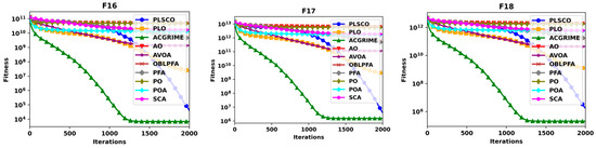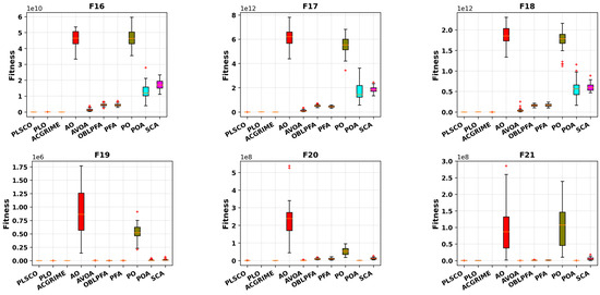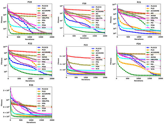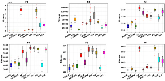 The experimental results presented in Table 4 for the CEC2020 benchmark functions demonstrate that PLSCO consistently obtained superior performance across various categories of optimization problems. For single-modal functions (F16), PLSCO achieved an average fitness value that significantly surpasses the traditional PLO, showcasing its enhanced exploitation capabilities. However, the best performance in F16 was achieved by the ACGRIME algorithm. In basic multimodal functions (F17–F19), PLSCO exhibited exceptional exploration abilities and resistance to local optima, particularly in F19, where it achieved the most optimal average fitness, matching the performance of the improved algorithm ACGRIME. While the performance of PLSCO in F17 and F18 was slightly lower than that of ACGRIME, it demonstrated a competitive capability to navigate multimodal landscapes effectively.