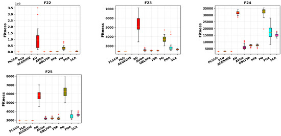 The integration of the SSA and CSO strategies within PLSCO is central to its superior performance. The competitive learning framework fosters diversity by dynamically classifying particles as winners and losers, encouraging both local refinement and global exploration. SSA operators ensure continuous exploration of the solution space, maintaining diversity and preventing premature convergence. Additionally, the methodological innovations in PLSCO enable it to excel in shifted, rotated, and hybrid functions within the CEC2020 benchmark, particularly in F20, F21, F22, F23, and F25, as shown in Figure 8. The box plot analyses in Figure 9 and Figure 10 further reinforce PLSCO’s stability, with tight distributions and minimal outliers, underscoring its robustness. The red “+” in the plots are outliers