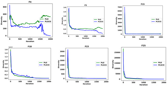 To emphasize the enhancements introduced by PLSCO over the standard PLO, a diversity analysis is conducted to evaluate the distribution of the population throughout the optimization process [55]. Population diversity captures the nonlinear dynamics of the population by measuring the average distance between individuals over iterations. A reduction in diversity, characterized by nonlinear behavior, suggests increased aggregation within the population, heightening the risk of premature convergence to suboptimal solutions. The population radius, defined as the maximum distance between any two individuals, is mathematically expressed in Equation (32) [56].