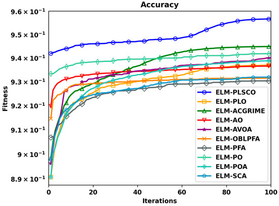 Furthermore, the convergence behavior, as depicted in Figure 13, illustrates the superior fitness and rapid stabilization of PLSCO relative to other optimization methods. Unlike competing algorithms, which exhibited slower or suboptimal convergence patterns, PLSCO achieved higher fitness values with fewer iterations, further validating its efficacy in enhancing the ELM-PLSCO model’s learning process. The plot provides valuable insights into their optimization performance. The fitness values for PLSCO are consistently higher throughout the iterations, clearly demonstrating its ability to quickly adapt and achieve optimal solutions. In contrast, other algorithms, such as AO and AVOA, exhibit slower convergence rates, requiring more iterations to approach fitness levels that are still below those achieved by PLSCO. Notably, PLSCO’s convergence curve shows a smooth and steady ascent, highlighting its efficiency in navigating the solution space without being hindered by local optima. This is a critical advantage in predictive maintenance applications, where timely and accurate predictions are essential for minimizing downtime and optimizing operational efficiency. The superior convergence behavior of PLSCO also suggests its potential applicability in other complex optimization scenarios.