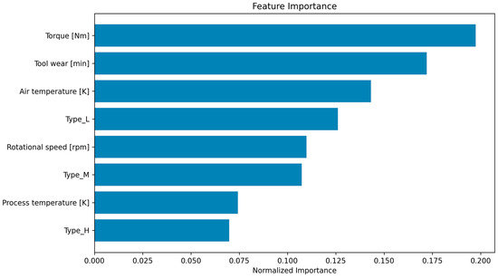 The feature importance analysis provides crucial insights into the predictive power of individual variables in the dataset for machine failure prediction. Feature importance was evaluated using the permutation importance score method, which assesses the decrease in model performance when the values of a given feature are randomly shuffled while all others remain unchanged. A greater drop in performance indicates a higher importance of that feature to the model’s predictions. As evident in Figure 16, torque emerges as the most significant feature, with the highest importance score. This indicates that torque plays a pivotal role in determining machine health, as variations in torque could directly reflect changes in mechanical load and operational efficiency. Following closely are tool wear and air temperature, both of which exhibit substantial contributions to the prediction model. The high importance of tool wear is expected, given its direct relationship to equipment degradation, while air temperature highlights the impact of environmental conditions on machine performance. The feature Type_L demonstrates a comparable level of importance. This is due to the inherent characteristics or operational conditions associated with these products, such as lower thresholds for durability or higher susceptibility to wear and tear. Rotational speed and Type_M exhibit moderate contributions, emphasizing their role in reflecting operational conditions.